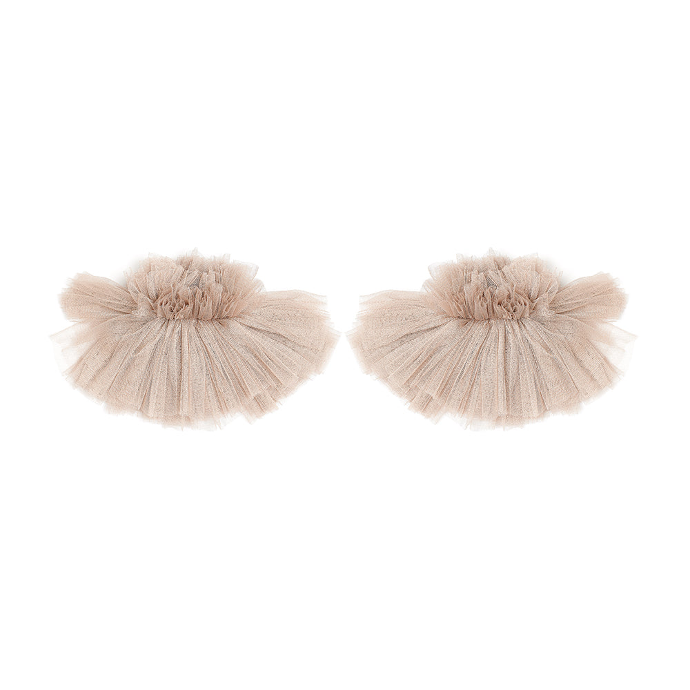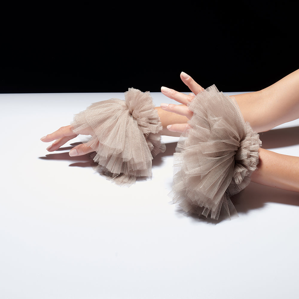 荷叶边裸色真丝薄纱袖口,手腕饰有薄纱褶边。
